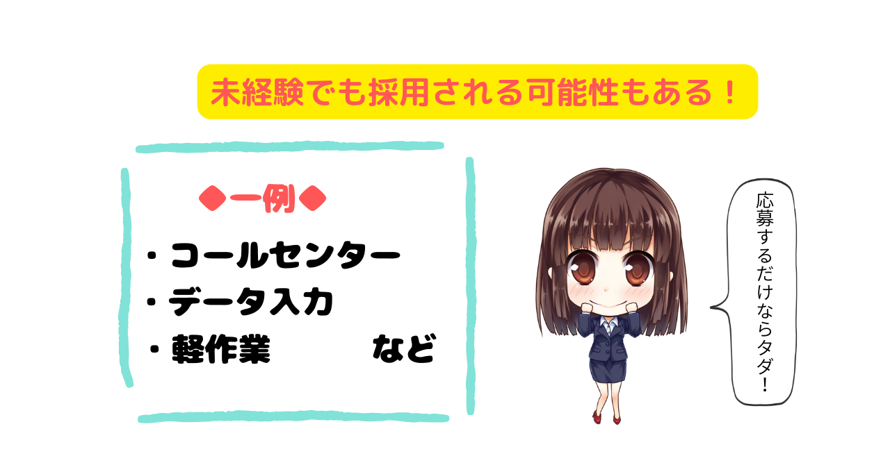 例えば、コールセンター、データ入力、軽作業などが代表的だよね。アナタはこういった仕事を経験したことあるかな?